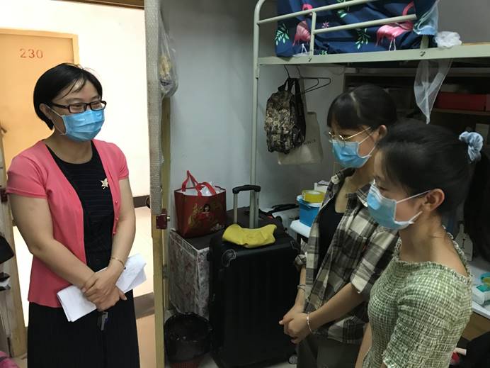 你展云帆济沧海,我挂婵娟待子还。为欢迎各位毕业生返校,荷花池前树立起以“心系家国,不负韶华”为主题的毕业墙,教二楼前“南望山下,荷花池畔,朝思暮想,盼君归来”的横幅格外醒目,6月24日,贝博官网第一批返校毕业生顺利“回家”。当天下午,学院党委书记瞿祥华,党委副书记于晓舟,副院长李波、副院长文国军、副院长罗杰和毕业研究生导师、毕业本科年级班主任、全体辅导员分组走访返校毕业生宿舍,了解同学们的思想动态,为各位毕业生送去学院的关心和祝福。