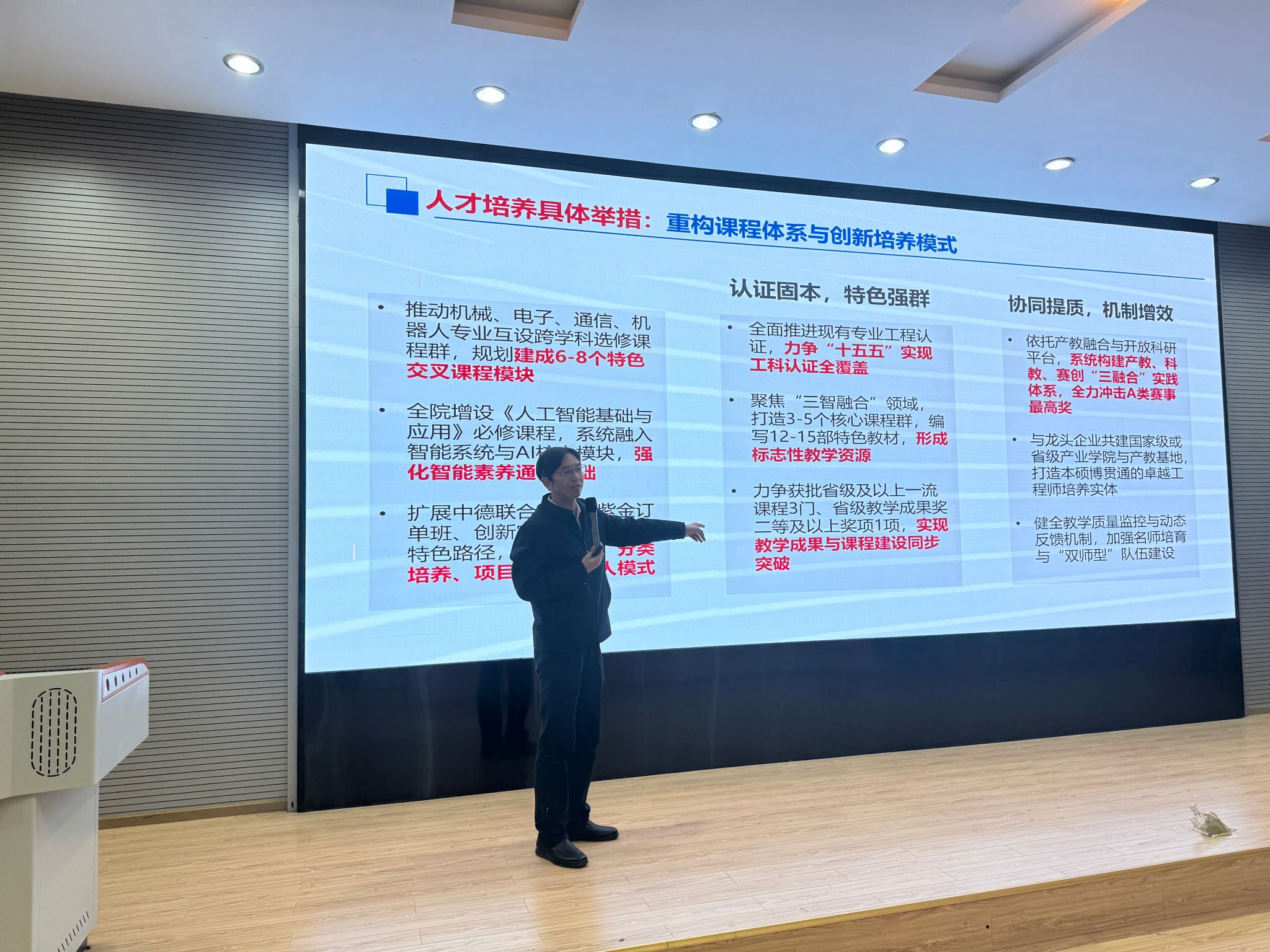 会上,宁伏龙院长以“十四五收官筑基,十五五启新奋进”为题作主旨报告。他系统回顾了学院“十四五”期间在人才培养、学科建设、科技创新及社会服务等领域取得的突破性进展:在55项发展规划指标中,超额完成28项,足额完成12项,总体完成率超过85%;科研经费到账总额达1.49亿元,纵向科研经费较规划目标增长超三倍;机器人工程、中德合作办学班等相继落地,电子信息工程专业获批国家级一流本科专业建设点,机械工程学科在教育部学科评估中由C级跃升至B-级,信息与通信工程学科由C-提升至C级,学院综合实力与核心竞争力显著增强。