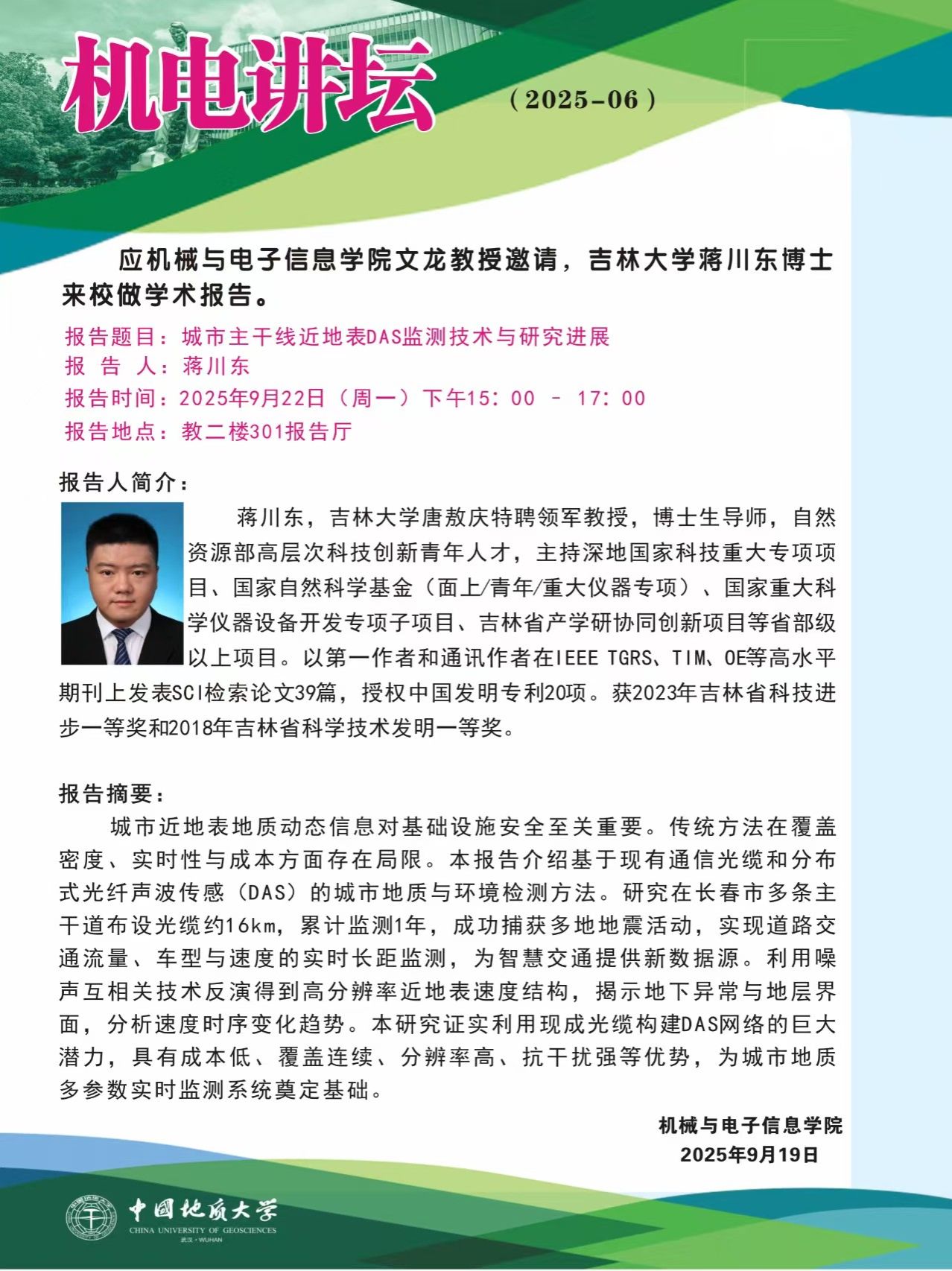 【9月22日】机电讲坛(2025-06)吉林大学蒋川东博士来校做学术报告
