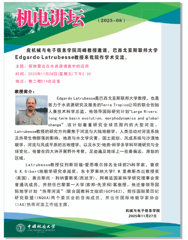 【11月28日】机电论坛(2025-08):巴西戈亚斯联邦大学Edgardo Latrubesse教授来贝博官网作学术交流