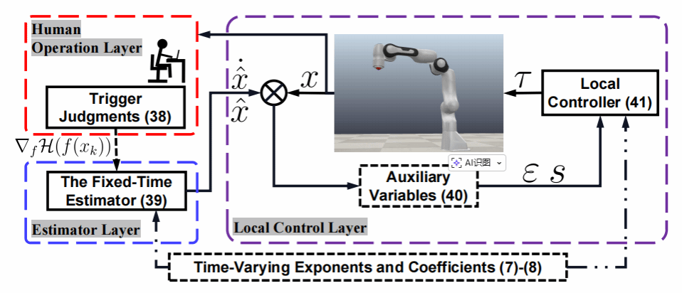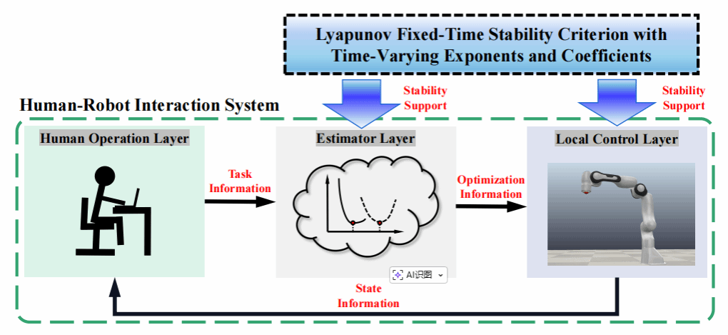 近日,我校艾弗森贝博ballbet官网葛明峰教授团队(付智辉、葛明峰、丁腾飞)与华中科技大学人工智能与自动化学院刘智伟教授团队合作的最新研究成果“Task optimization for fixed-time control of intermittent human-robot interaction with time-varying exponents and coefficients”被国际主流期刊《IEEE Transactions on Cybernetics》(2026年1月26日最新影响因子10.5,最新学校分区为T1)在线发表(DOI:10.1109/TCYB.2026.3650907)。该文提出了一种分层固定时间事件触发优化(Hierarchical Fixed-Time Event-Triggered Optimization,HFTEO)算法,旨在提升人类与机器人在动态环境中协作任务的效率与安全性。随着人工智能和机器人技术的快速发展,人机协作系统在工业、医疗、服务等多个领域的应用日益广泛。传统的机器人控制系统通常依赖于精确的指令与数据输入,但在实际应用中,人类操作员的决策往往是不确定和变化的,这对机器人的稳定性和任务执行效率提出了更高的要求。传统的任务优化方法往往依赖于连续和稳定的操作环境,但实际的人机交互通常是间歇性的,且存在不确定性,例如人类操作员的反应时间延迟、意图变化以及机器人控制的响应能力等。这使得如何在不确定的交互环境中确保任务的高效完成,成为一个亟待解决的技术难题。
