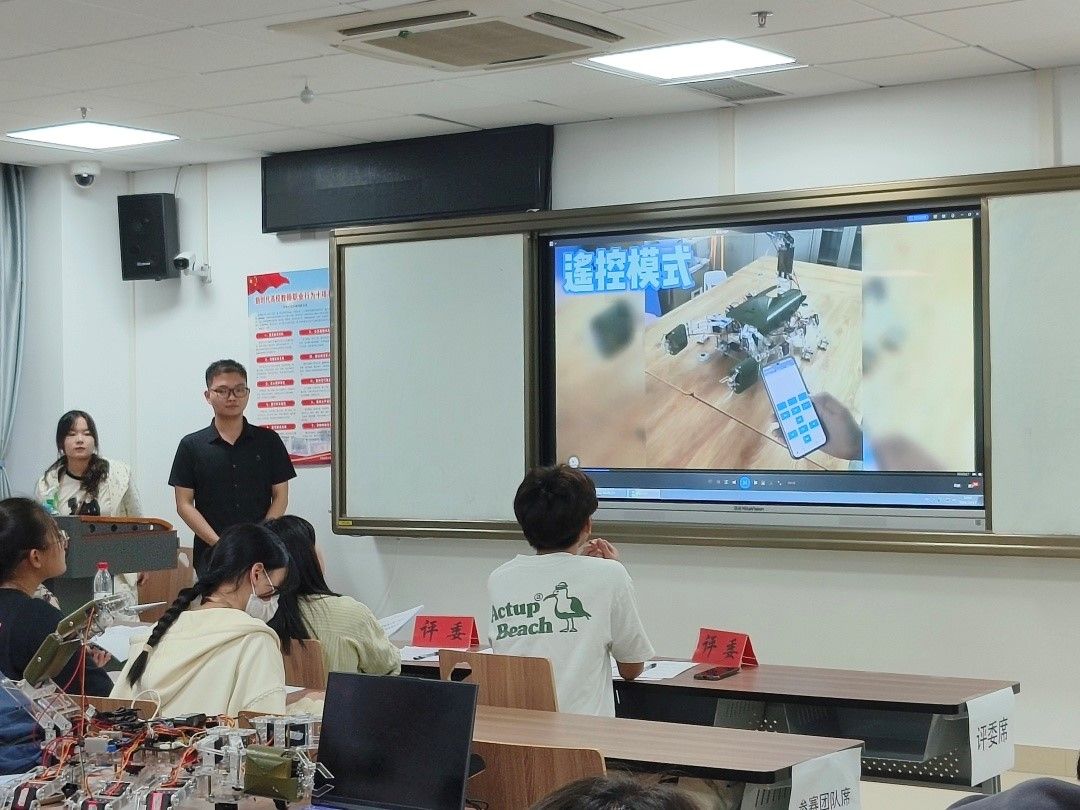 会议采取“5+3”的答辩模式,共7支本科生团队入围决赛参与答辩,内容涵盖软件算法设计和过程优化、机械智能装备研发等。杨心悦团队展示了智能家用陪护机器人蛋仔plu,重点围绕研发产品背景、智能对话功能、空气温湿度检测以及表情识别等功能的实现方法进行介绍。吴婷婷团队讲解了简易录音识别屏蔽系统的研制工作,介绍了声音处理系统想法来源、工作原理、突出特点等,并围绕评委老师针对产品重点研究方向的疑问进行了解答。陈维瑞团队、李言恒团队也分别围绕自身研制的家用娱乐陪伴守护一体宠物机器人、高性能仿生机械产品进行了介绍,并围绕产品机械结构设计、WIFI通信功能等技术性问题进行了解答。
