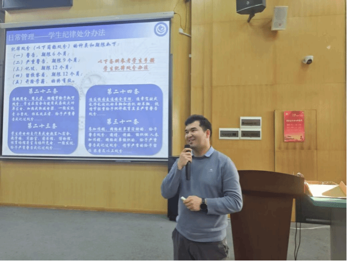 日常管理:守住底线,方能行稳致远。大会最后环节,年级辅导员阿迪力就日常管理与近期重点工作进行了强调。宿舍安全、离校请假、纪律处分……他结合具体案例,提醒同学们严格遵守校规校纪。“良好的学习生活环境,需要每一位同学共同维护。”对于近期即将到来的重点考试与比赛,他提醒大家注意时间节点,合理安排复习计划。“前五个学期已经过去,重要的是从现在开始重新出发。”他鼓励大家进行自我反思,重振旗鼓,以更好的状态迎接新的挑战。